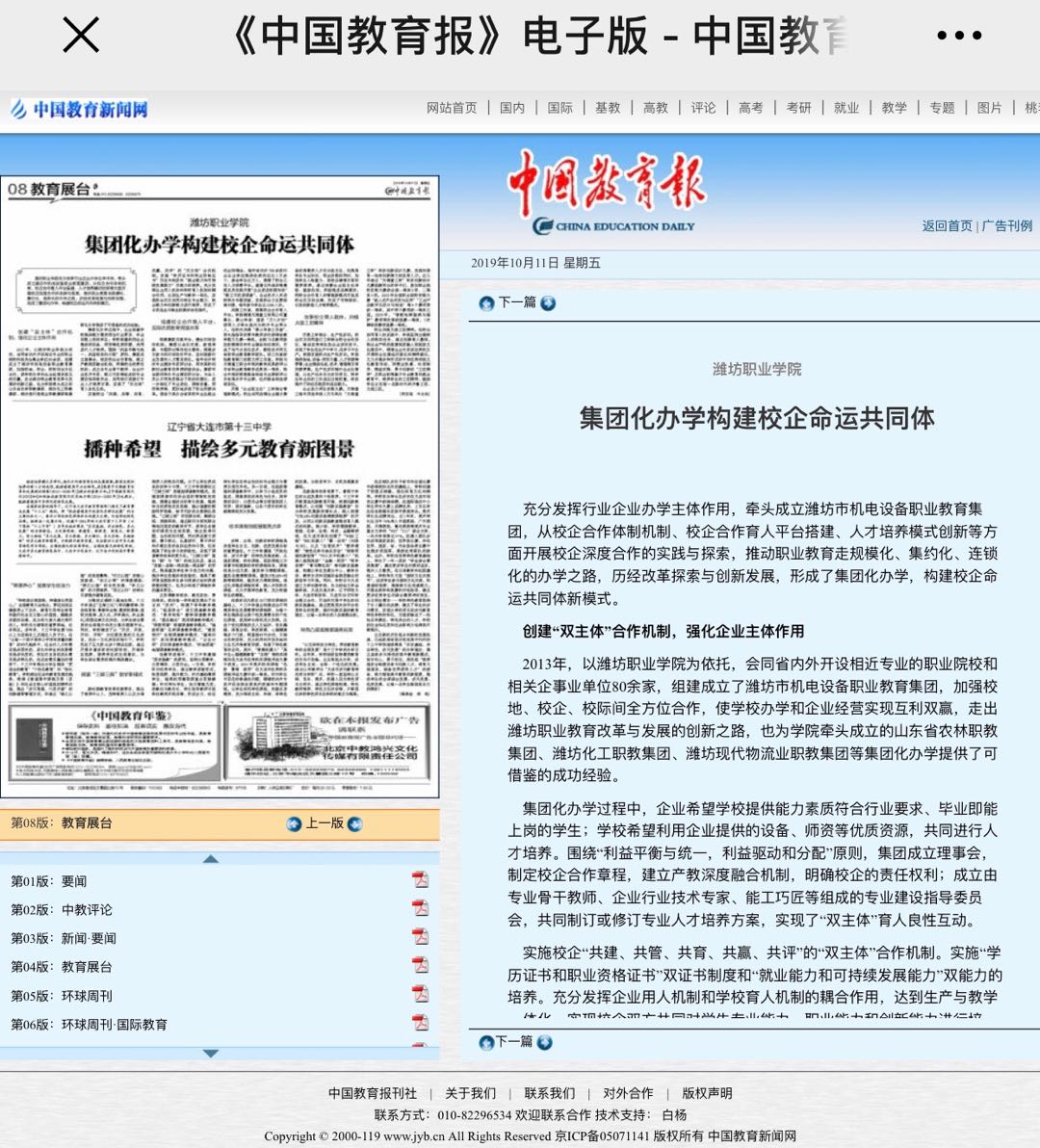 充分发挥行业企业办学主体作用,牵头成立潍坊市机电设备职业教育集团,从校企合作体制机制、校企合作育人平台搭建、人才培养模式创新等方面开展校企深度合作的实践与探索,推动职业教育走规模化、集约化、连锁化的办学之路,历经改革探索与创新发展,形成了集团化办学,构建校企命运共同体新模式。