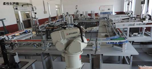 柔性生产线实训室面向电气自动化技术、机电一体化技术、数控技术等专业。承担PLC技术、组态技术、工业网络技术、变频调速技术等项目的实训,含有落料、喷涂烘干、加盖、穿销、检测、成废品分拣、物流仓储、行车机械手等十六个单元的安装调试及系统联调等实训项目,采用与实际生产功能完全一样的自动生产线模拟设备。