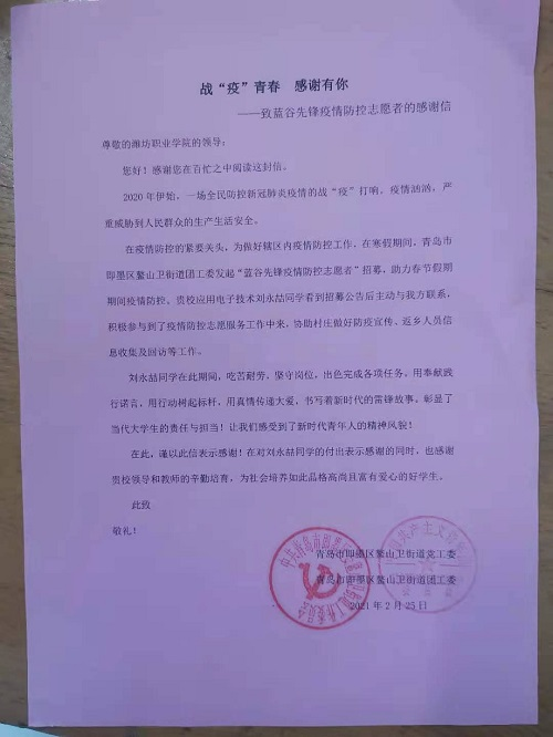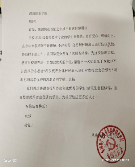 来信对公司2020级数控技术专业刘晓倩同学和应用电子技术专业刘永喆同学积极参与疫情防控志愿服务工作给予高度赞扬,对公司为社会培养出如此优秀且乐于奉献的好员工致以衷心的感谢。在疫情防控的紧要关头,两位同学协助村庄开展疫情防控知识宣传,返乡人员信息收集及回访等工作,热心服务居民生活,充分发挥了志愿者精神,为抗击疫情做出贡献。