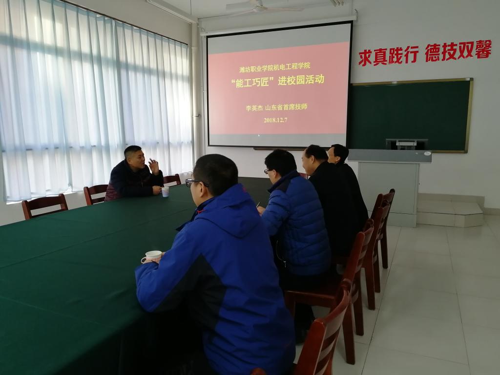 李英杰是潍柴动力的高级技师,先后被评为齐鲁首席技师、山东省机械行业首席技师、山东省有突出贡献的技师、山东省机械行业优秀科技工作者等称号。李英杰与公司教师进行了座谈,以亲身经历阐释了“工匠精神”的深刻内涵,并到自动化大赛实训室、创新社团进行现场指导,他身上的踏实肯干、勇于创新、精益求精的“工匠精神”感染了被指导员工。