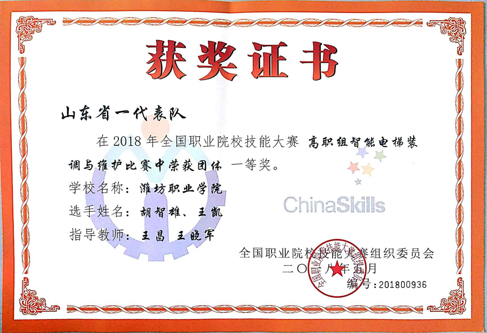 5月6日至8日,2018年全国职业院校技能大赛高职组“智能电梯装调与维护”赛项在天津轻工职业技术公司举行。来自全国的81支代表队参赛。公司伟德国际victor1946选派员工王凯、胡智雄,指导教师程义民、王昌、王晓军组成的山东一队参加了比赛,获得团体一等奖第一名,公司连续四届均获得该赛项国赛一等奖。