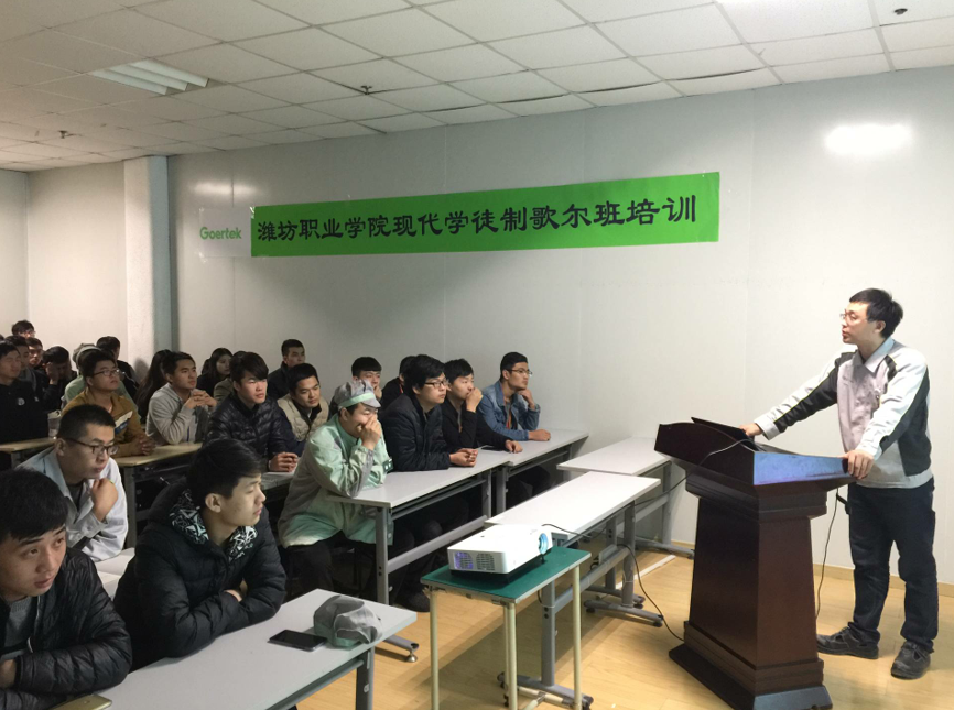现代学徒制试点项目是公司以省级现代学徒制试点为契机,与歌尔股份有限公司签订的战略性合作项目。今年9月18日, 2016级数控技术专业44名员工在歌尔股份有限公司的培训中心举行了隆重的拜师仪式,李瑞昌副经理和企业副董事长参与了仪式,并被媒体“直播潍坊栏目”全程报道。截止发稿目前,44名学徒均在歌尔PMF-PPM事业部注塑中心重要岗位任职,学习工作情况良好,得到企业领导一致好评。