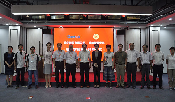 9月19日上午,公司数控技术专业现代学徒制班拜师仪式在歌尔股份有限公司会议室举行。公司副经理李瑞昌、歌尔股份有限公司副总裁李菁华出席。教务处、科技处、伟德国际victor1946负责人,歌尔股份有限公司校企合作负责人和工作人员,以及学徒制班全体师徒参加。