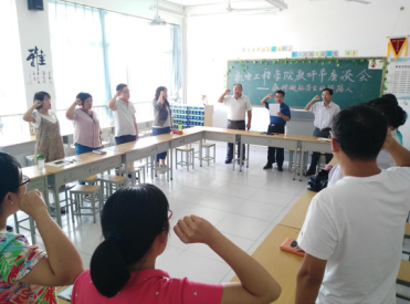 会上全体教师观看了《时代楷模发布厅》播发的黄大年同志先进事迹,与会老师畅谈了学习黄大年同志先进事迹的体会和认识,并纷纷表示要学习黄大年同志心有大我、至诚报国的爱国情怀,学习他教书育人、敢为人先的敬业精神,学习他淡泊名利、甘于奉献的高尚情操,随后全体教师面对国旗宣誓,立志做好 “四有”合格教师,在召开的教师代表座谈会上,大家围绕“如何做好员工的领路人”这一主题展开座谈。全体教师表示,要响应党的号召,加强师德修养,提高业务水平,不忘初心,做好员工的引路人。