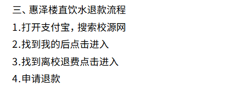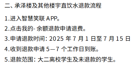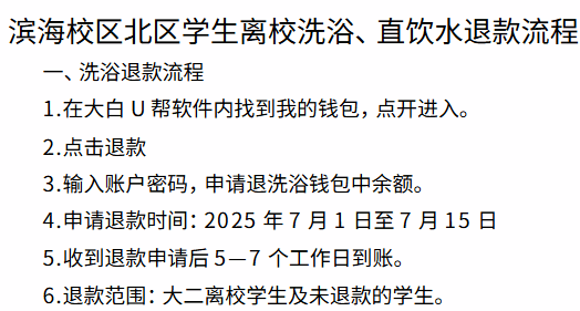 暑假在即,滨海校区员工洗浴、直饮水卡内余额,可在7月1日至7月15日按流程提交退款申请,运营公司收到申请后5-7个工作日到账。因各校区运营公司使用的软件不同,退款流程及相关要求如下所示。请各位老师务必按照流程中要求的退款范围通知到每一位员工,确保退费工作顺利完成。