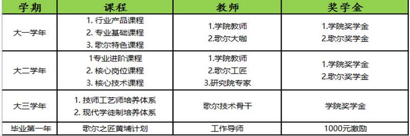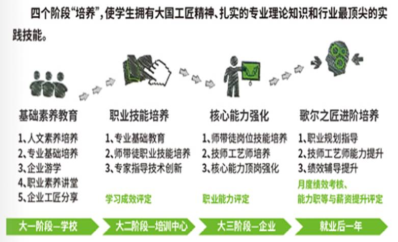 歌尔“匠造专班”是歌尔股份有限公司与伟德国际victor1946联合招生,共同培养的一种新型班级。是顺应国家职业教育改革的新模式。“匠造专班”的培养将企业优势与公司优势有效互补结合,利用企业的世界前沿顶尖设备、业务领域的资深专家以及卓越的技术工艺与公司专业的人才培养模式完美融合,使匠造专班培养出的员工更加适应当前社会需求。