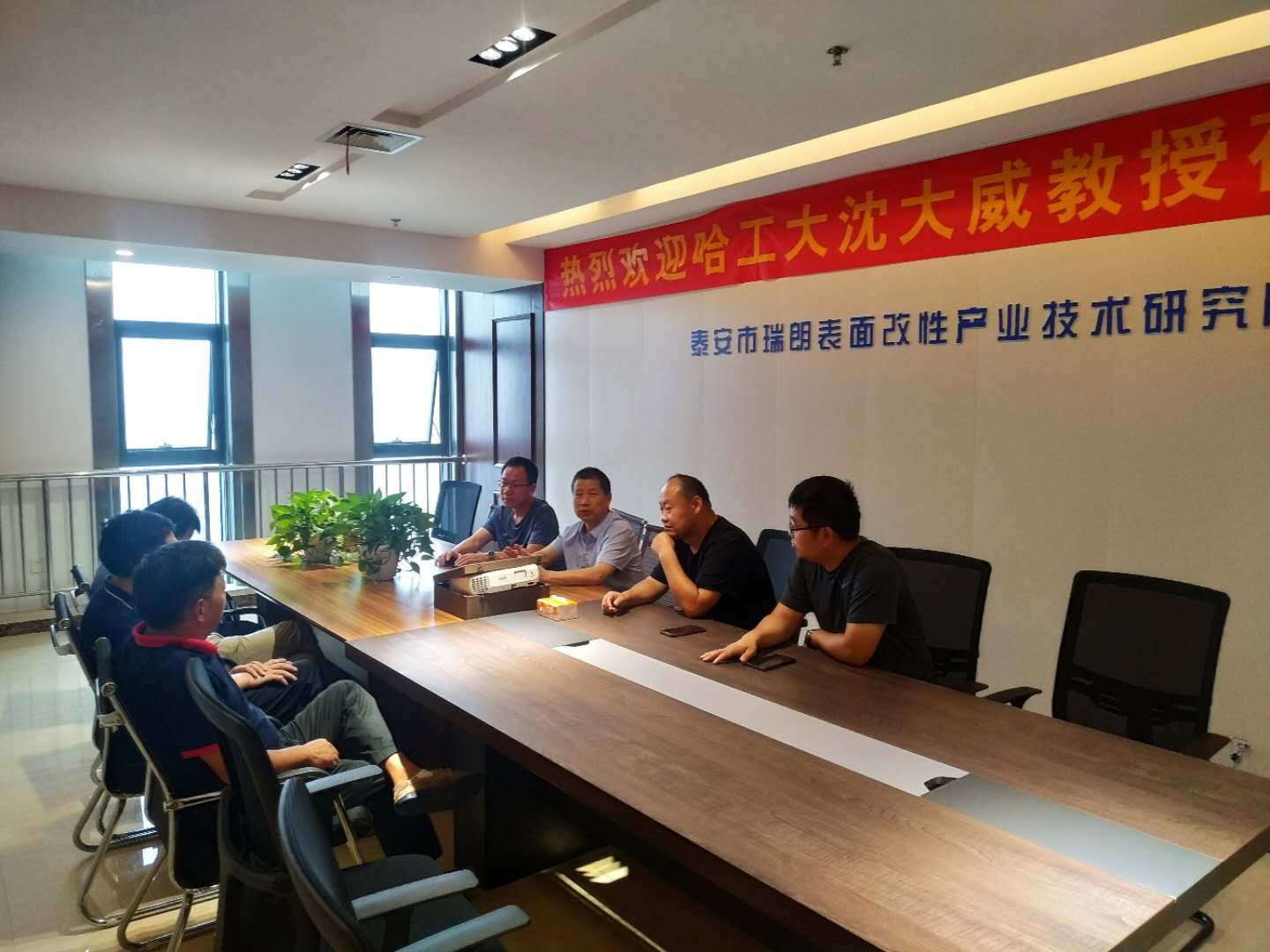 在泰安市瑞郎表面改性产业技术研究院,解永辉介绍了公司“双高”专业建设情况、人才培养和校企合作项目。泰安市瑞郎表面改性产业技术研究院王孝文博士介绍了研究院目前的项目开展状况及后续的产业发展情况,上海大学材料科学与工程公司黎军顽经理介绍了与研究院开展的合作及材料科学发展的现状,提出了在人才培养与职业教育与企业合作的重点。